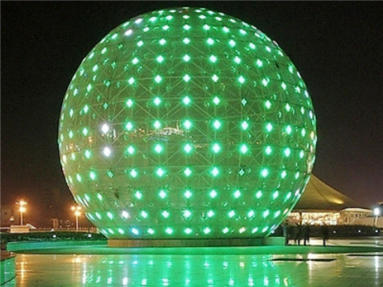 該網(wǎng)架直徑為56米,采用正放四角錐螺栓節(jié)點圓形四周采用中空夾角玻璃,自由排水,總工期90余天。